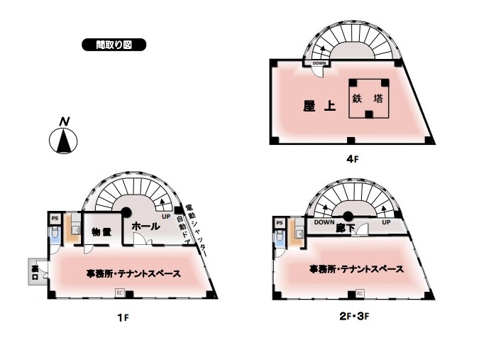 事務所テナントスペース×3階各階、トイレ・簡易キッチン×3階各階、屋上